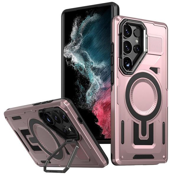 For Samsung Galaxy S22 Ultra 5G Shield Hollow Frame Holder MagSafe Phone Case(Rose Gold)