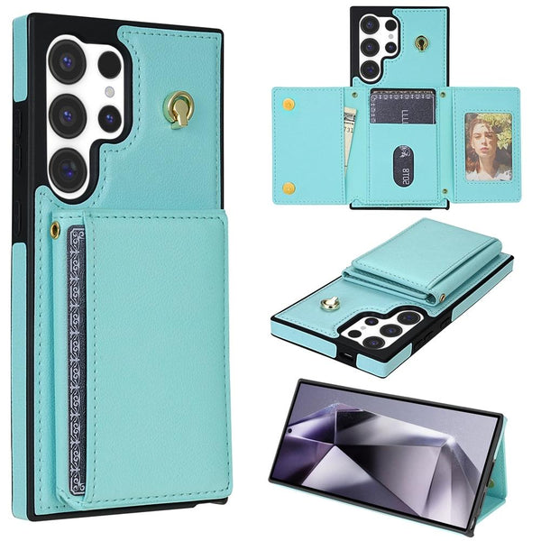 For Samsung Galaxy S22 Ultra 5G Three Fold Card Bag Phone Case with Long Lanyard(Mint)