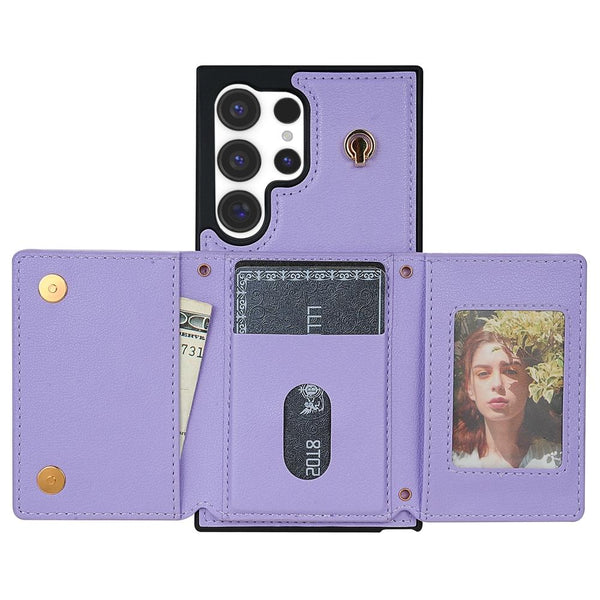 For Samsung Galaxy S22 Ultra 5G Three Fold Card Bag Phone Case with Long Lanyard(Purple)