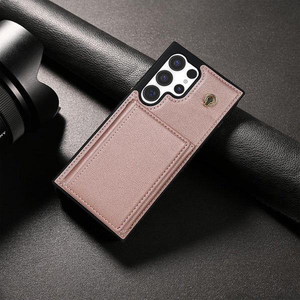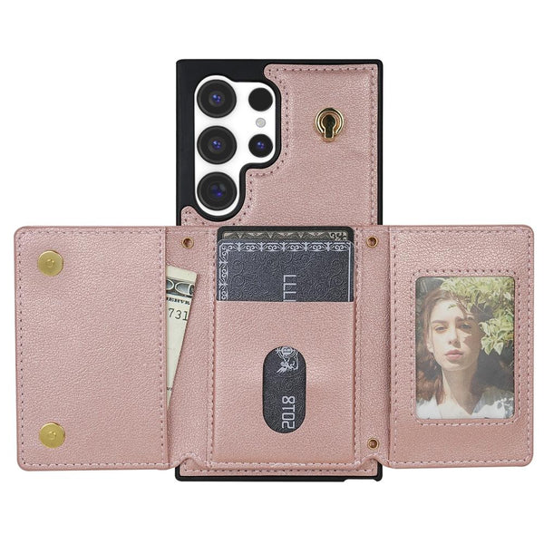For Samsung Galaxy S22 Ultra 5G Three Fold Card Bag Phone Case with Long Lanyard(Rose Gold)