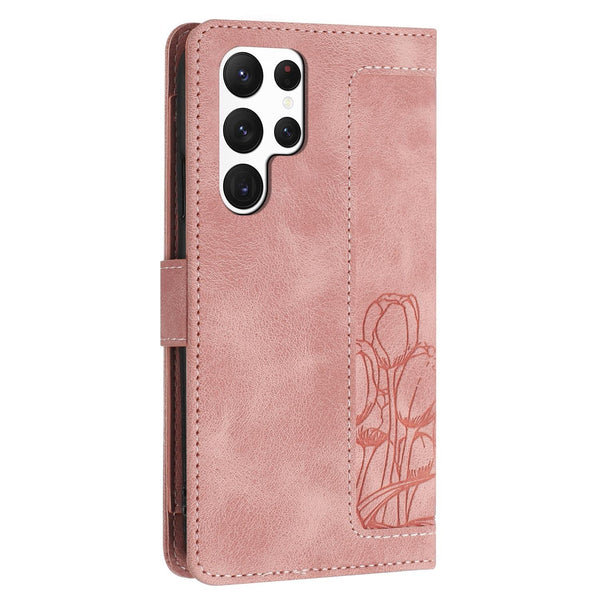 For Samsung Galaxy S22 Ultra 5G Tulips Embossed Leather Phone Case with Lanyard(Pink)