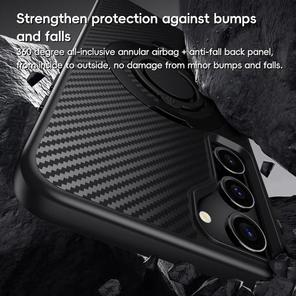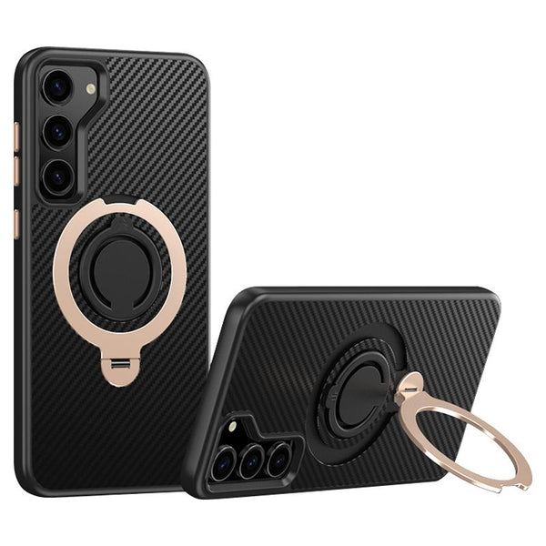 For Samsung Galaxy S23 5G Carbon Fiber MagSafe Phone Case with 360 Degree Rotating Holder(Black Gold)