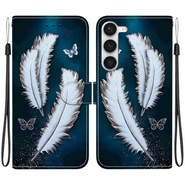 For Samsung Galaxy S23 5G Crystal Texture Colored Drawing Leather Phone Case(White Butterfly Feathers)