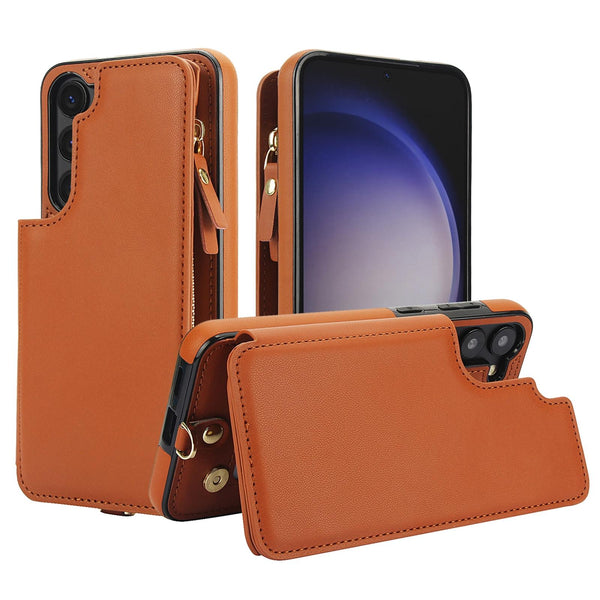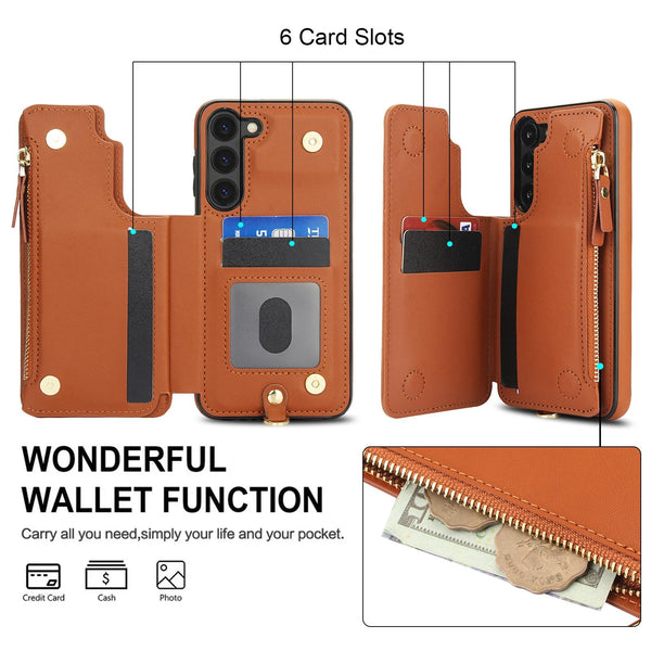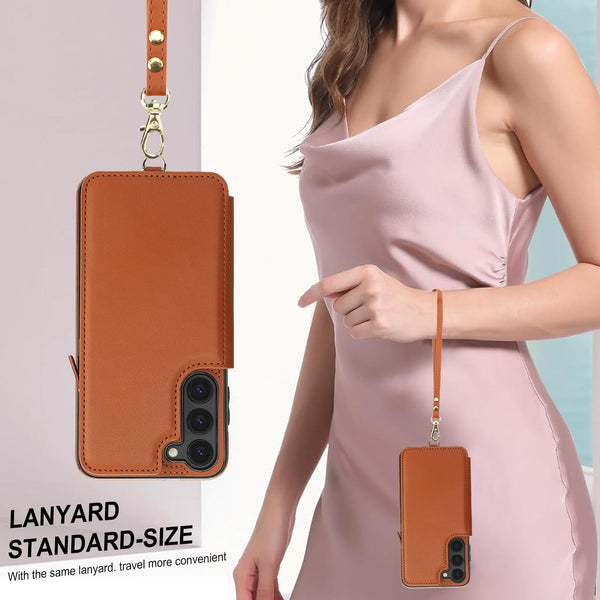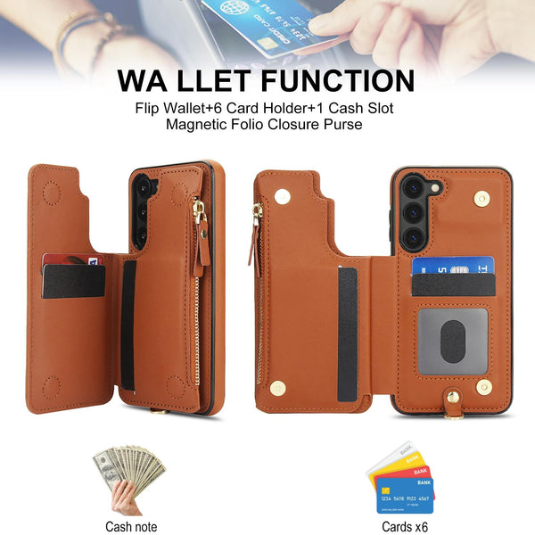 For Samsung Galaxy S23+ 5G Double Flap Zipper RFID Leather Phone Case with Short Lanyard(Brown)