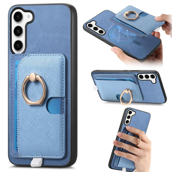 For Samsung Galaxy S23 5G Retro Cross Leather Ring Side Insert Card Bag MagSafe Phone Case(Blue)