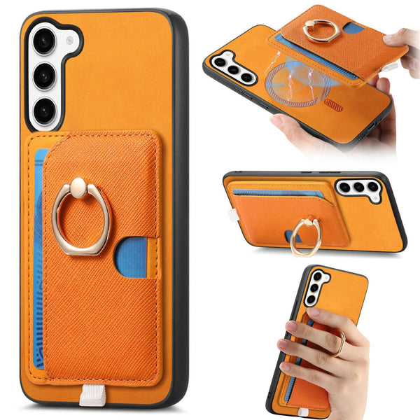 For Samsung Galaxy S23 5G Retro Cross Leather Ring Side Insert Card Bag MagSafe Phone Case(Yellow)