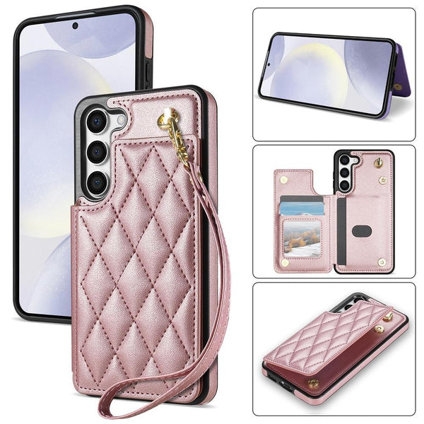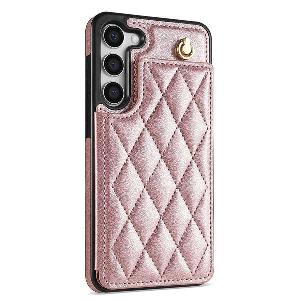 For Samsung Galaxy S23+ 5G Rhombic Dual Buckle Card Slots Phone Case with Lanyard(Rose Gold)