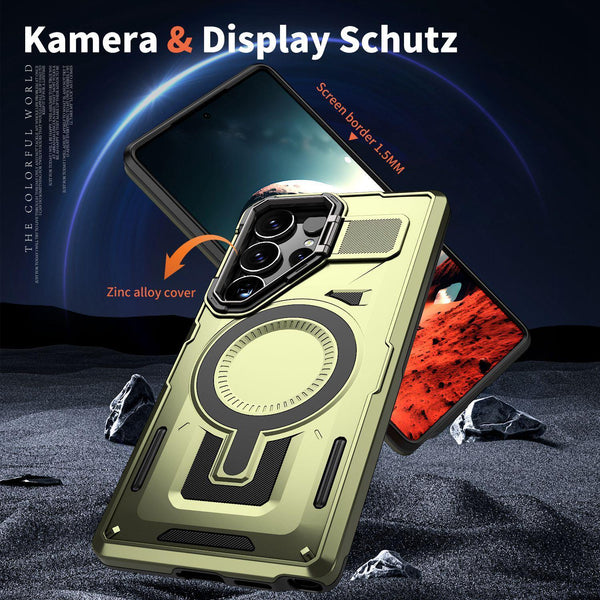 For Samsung Galaxy S23+ 5G Shield Hollow Frame Holder MagSafe Phone Case(Olive Green)