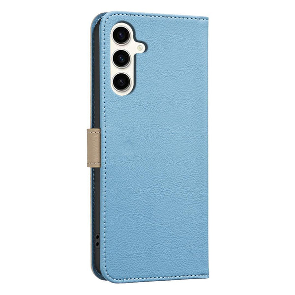 For Samsung Galaxy S23 5G Splicing Color Hollow Flower Pattern RFID Leather Phone Case(Baby Blue)
