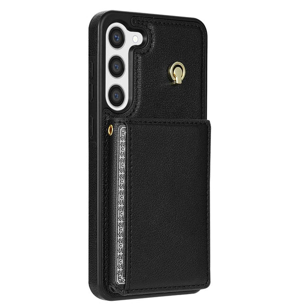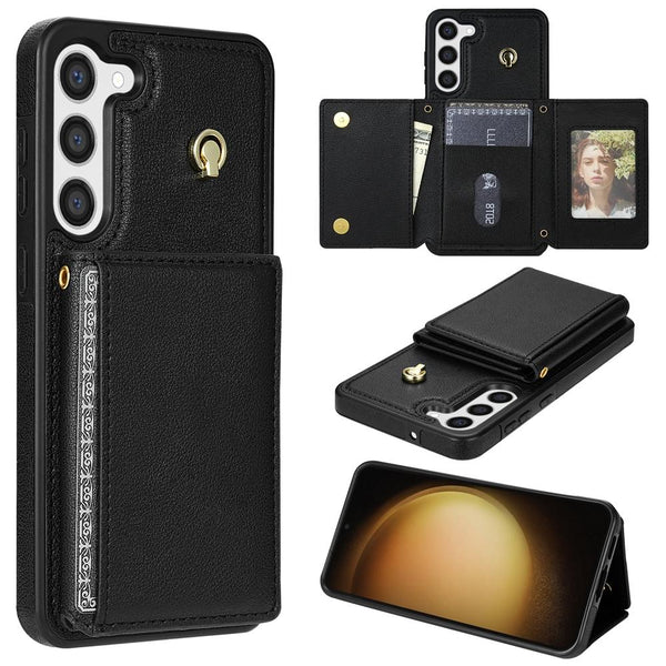 For Samsung Galaxy S23 5G Three Fold Card Bag Phone Case with Long Lanyard(Black)
