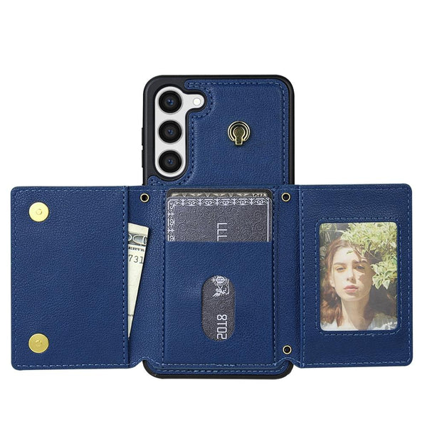 For Samsung Galaxy S23 5G Three Fold Card Bag Phone Case with Long Lanyard(Blue)