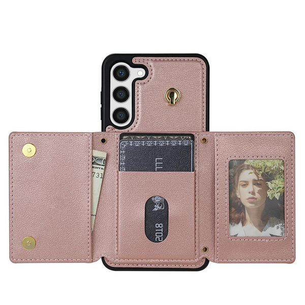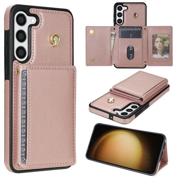 For Samsung Galaxy S23+ 5G Three Fold Card Bag Phone Case with Long Lanyard(Rose Gold)
