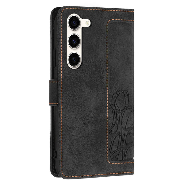 For Samsung Galaxy S23 5G Tulips Embossed Leather Phone Case with Lanyard(Black)