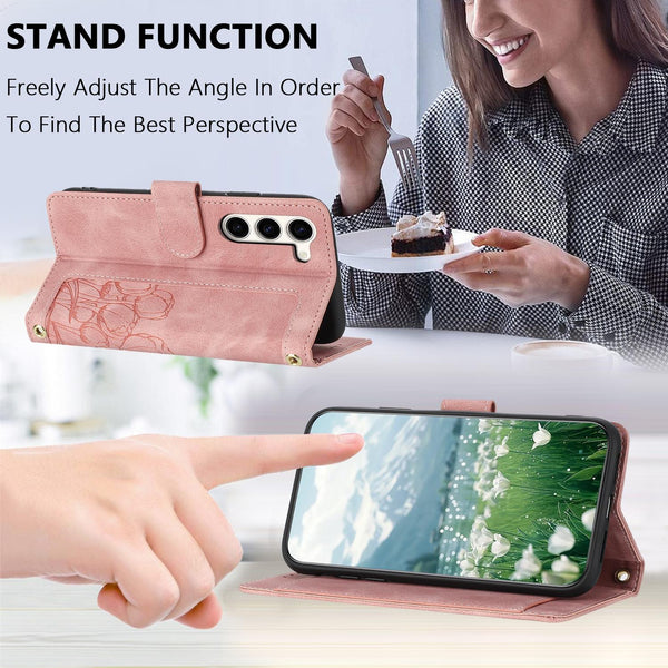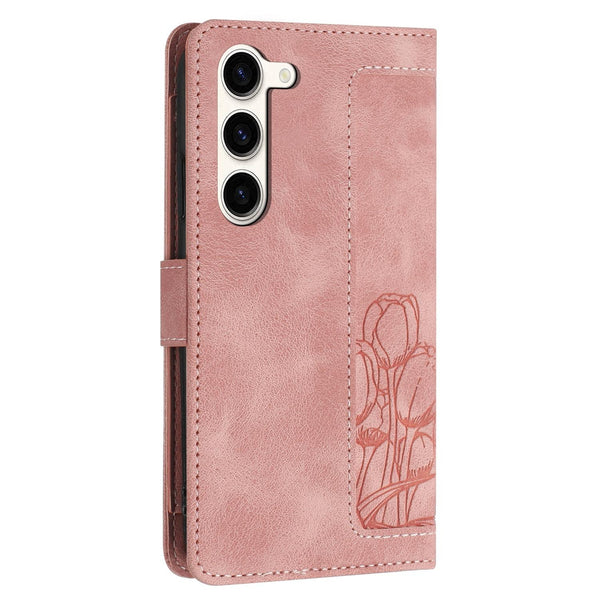 For Samsung Galaxy S23+ 5G Tulips Embossed Leather Phone Case with Lanyard(Pink)