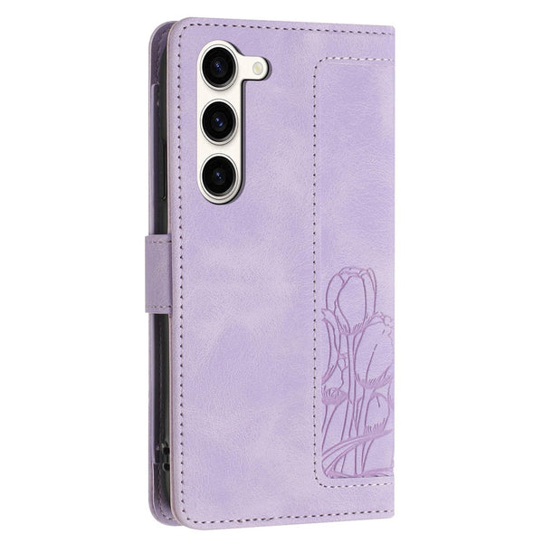 For Samsung Galaxy S23+ 5G Tulips Embossed Leather Phone Case with Lanyard(Purple)