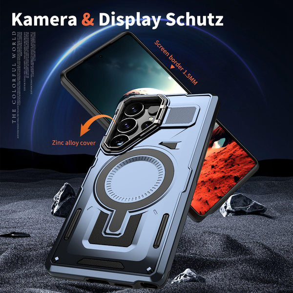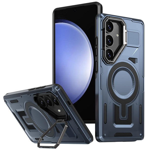 For Samsung Galaxy S23 FE 5G Shield Hollow Frame Holder MagSafe Phone Case(Navy Blue)