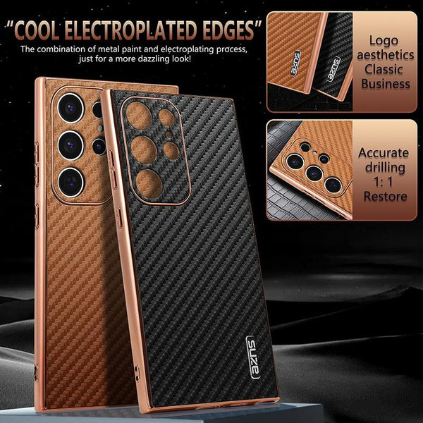 For Samsung Galaxy S23 Ultra 5G AZNS Electroplated Edge Carbon Fiber Texture Phone Case(Brown)