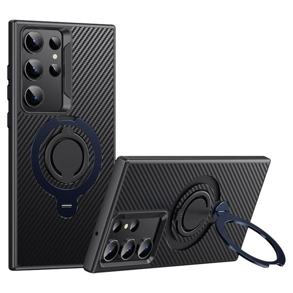 For Samsung Galaxy S23 Ultra 5G Carbon Fiber MagSafe Phone Case with 360 Degree Rotating Holder(Black Blue)