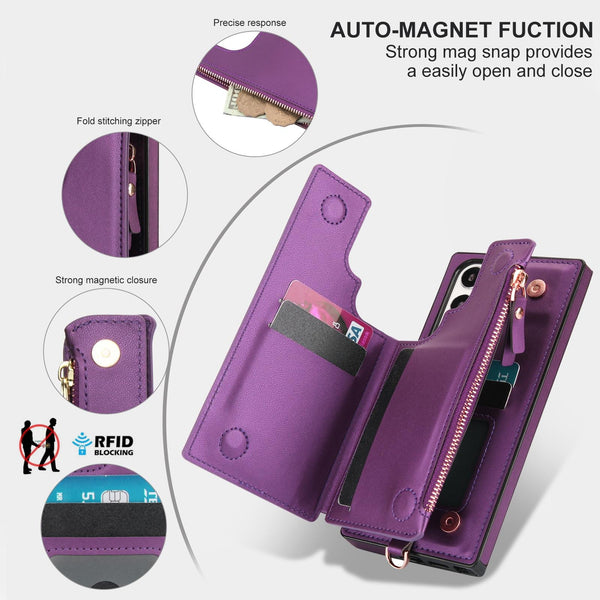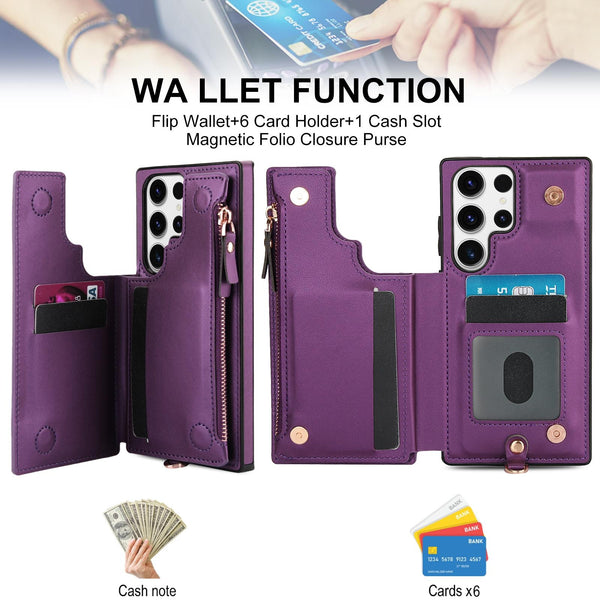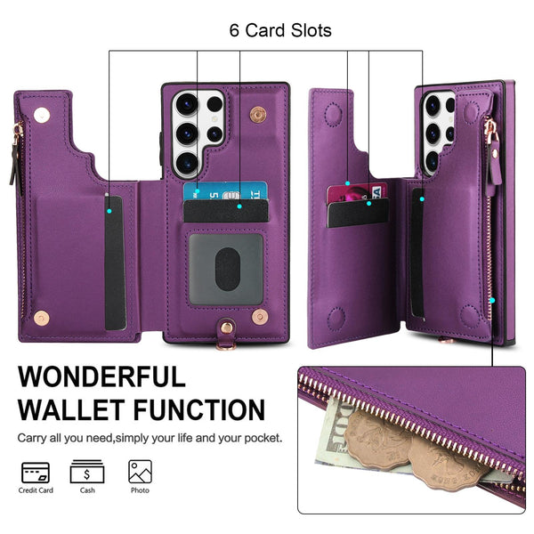 For Samsung Galaxy S23 Ultra 5G Double Flap Zipper RFID Leather Phone Case with Short Lanyard(Dark Purple)