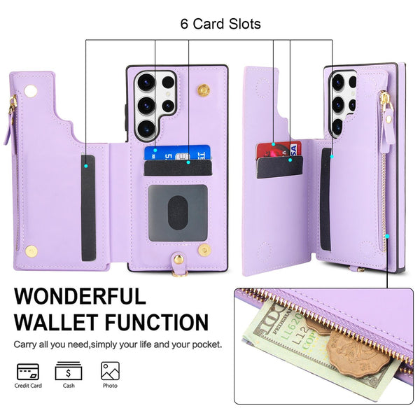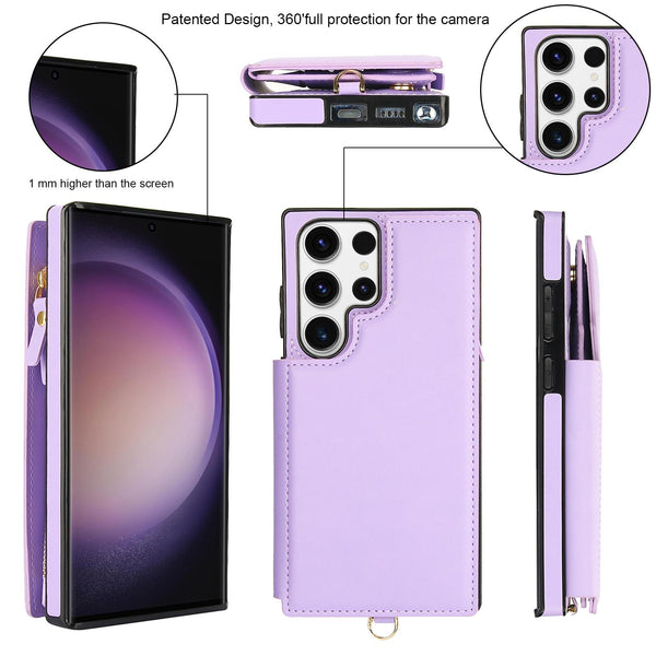 For Samsung Galaxy S23 Ultra 5G Double Flap Zipper RFID Leather Phone Case with Short Lanyard(Light Purple)