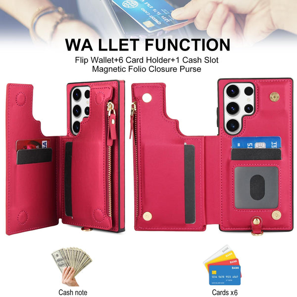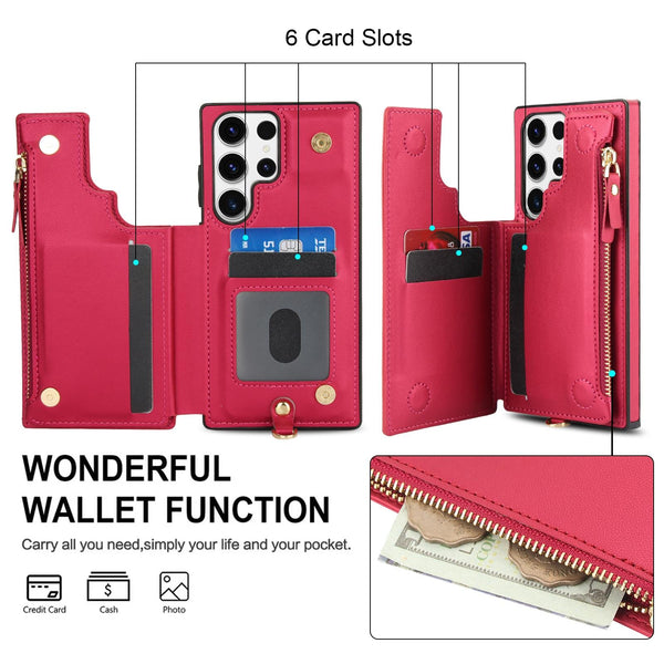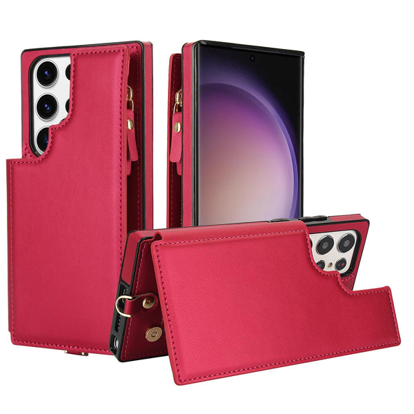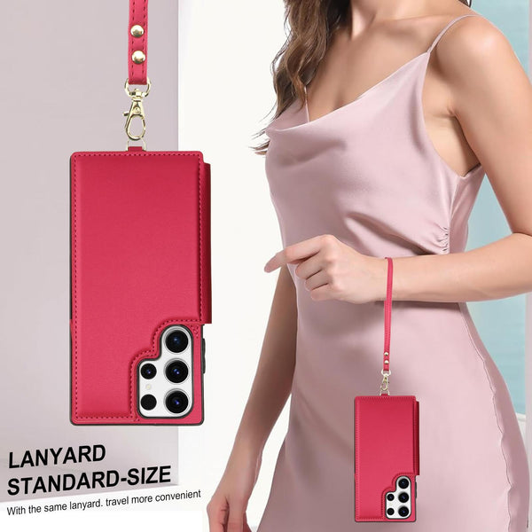 For Samsung Galaxy S23 Ultra 5G Double Flap Zipper RFID Leather Phone Case with Short Lanyard(Red)