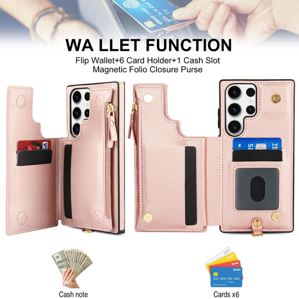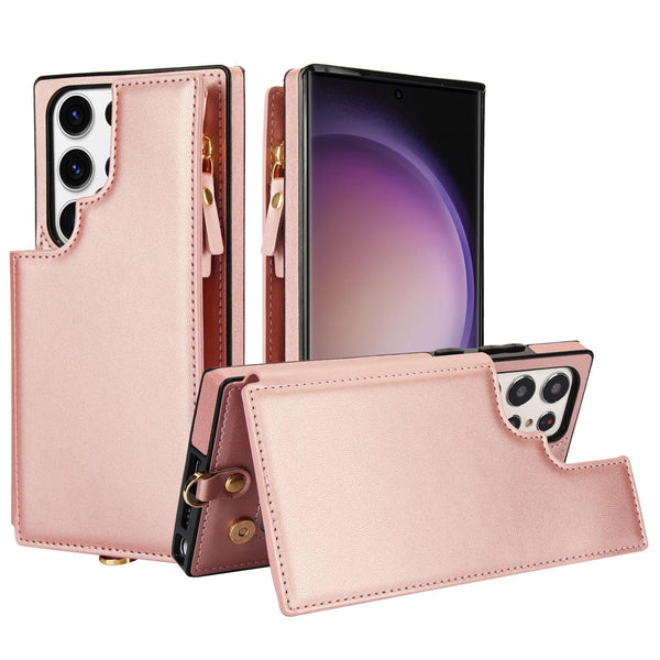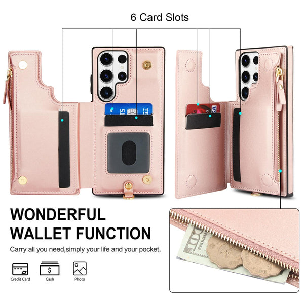 For Samsung Galaxy S23 Ultra 5G Double Flap Zipper RFID Leather Phone Case with Short Lanyard(Rose Gold)