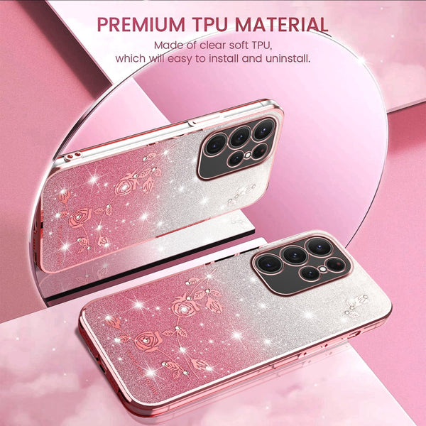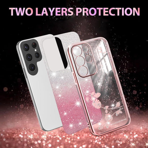 For Samsung Galaxy S23 Ultra 5G Gradient Glitter Flower All-inclusive Phone Case(Pink)