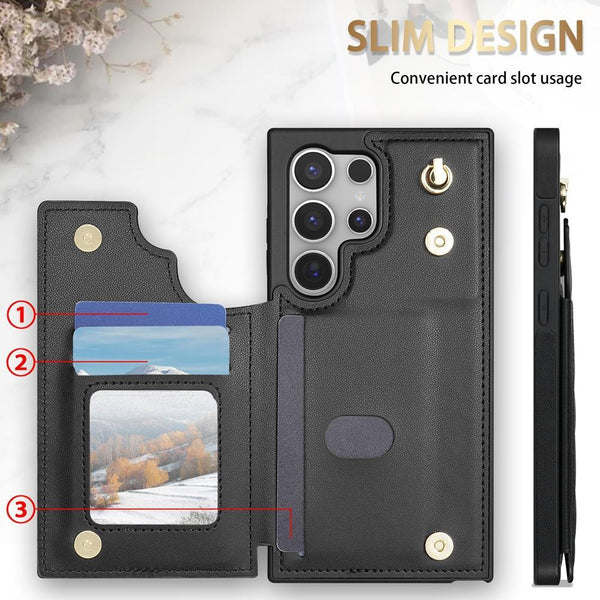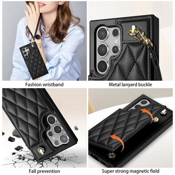 For Samsung Galaxy S23 Ultra 5G Rhombic Dual Buckle Card Slots Phone Case with Lanyard(Black)