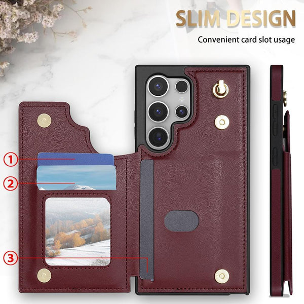 For Samsung Galaxy S23 Ultra 5G Rhombic Dual Buckle Card Slots Phone Case with Lanyard(Wine Red)