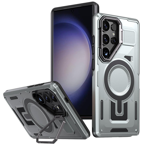 For Samsung Galaxy S23 Ultra 5G Shield Hollow Frame Holder MagSafe Phone Case(Grey)