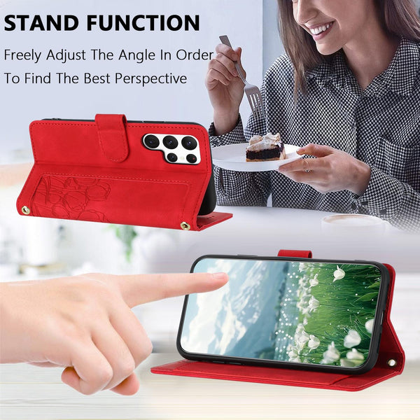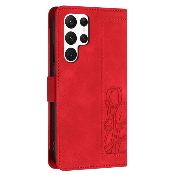 For Samsung Galaxy S23 Ultra 5G Tulips Embossed Leather Phone Case with Lanyard(Red)