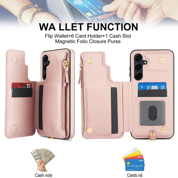 For Samsung Galaxy S24 FE 5G Double Flap Zipper RFID Leather Phone Case with Short Lanyard(Rose Gold)