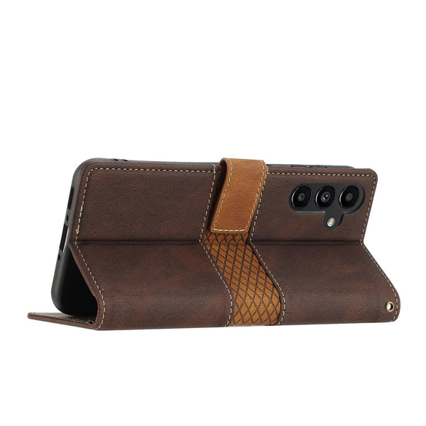 For Samsung Galaxy S24 FE 5G Grid Stitching Leather Phone Case with Lanyard(Brown)