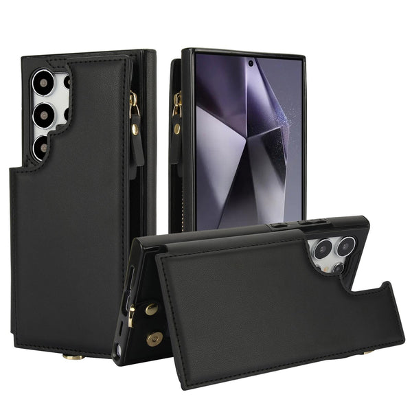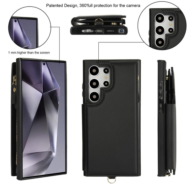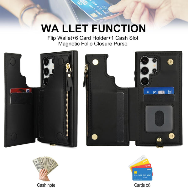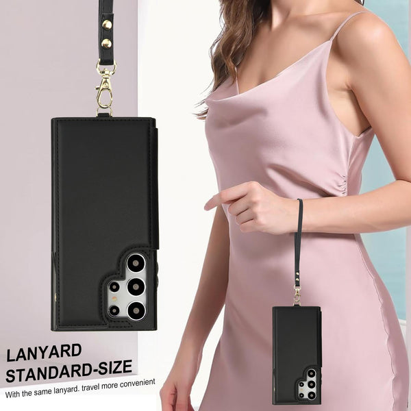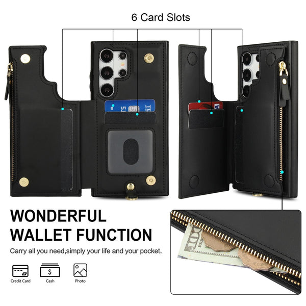 For Samsung Galaxy S24 Ultra 5G Double Flap Zipper RFID Leather Phone Case with Short Lanyard(Black)