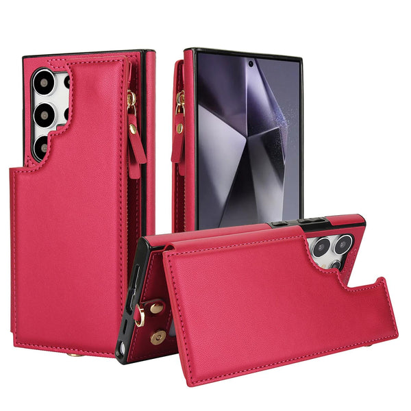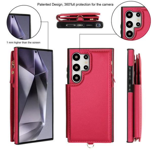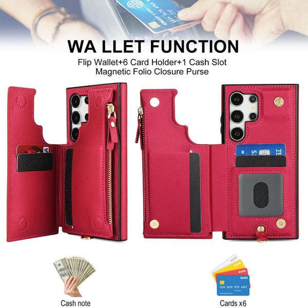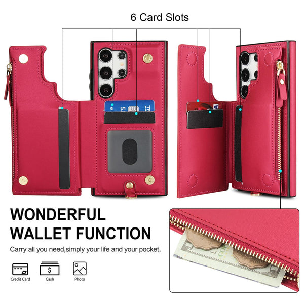 For Samsung Galaxy S24 Ultra 5G Double Flap Zipper RFID Leather Phone Case with Short Lanyard(Red)