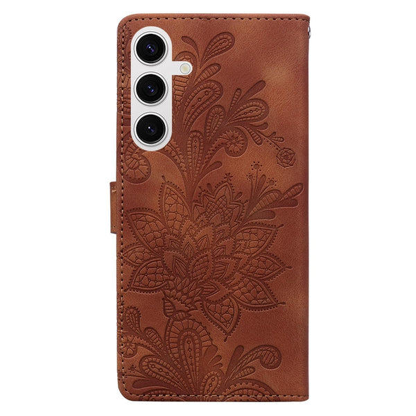 For Samsung Galaxy S25 5G Lace Floral Embossed Magnetic Buckle PU Phone Case With Wrist Strap(Brown)