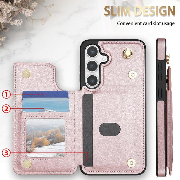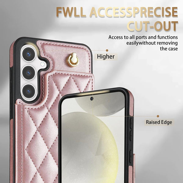 For Samsung Galaxy S25 5G Rhombic Dual Buckle Card Slots Phone Case with Lanyard(Rose Gold)
