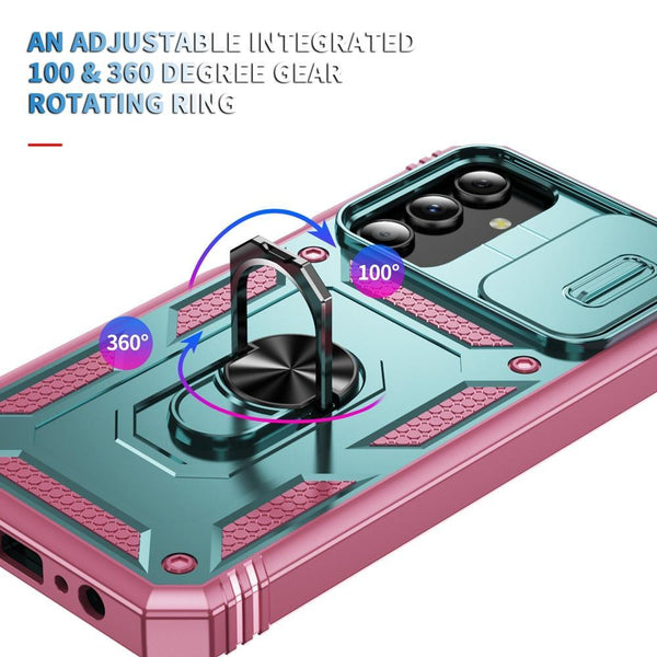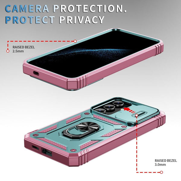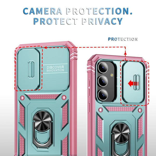 For Samsung Galaxy S25 5G Sliding Camshield TPU Hybrid PC Phone Case with Holder(Green+Pink)