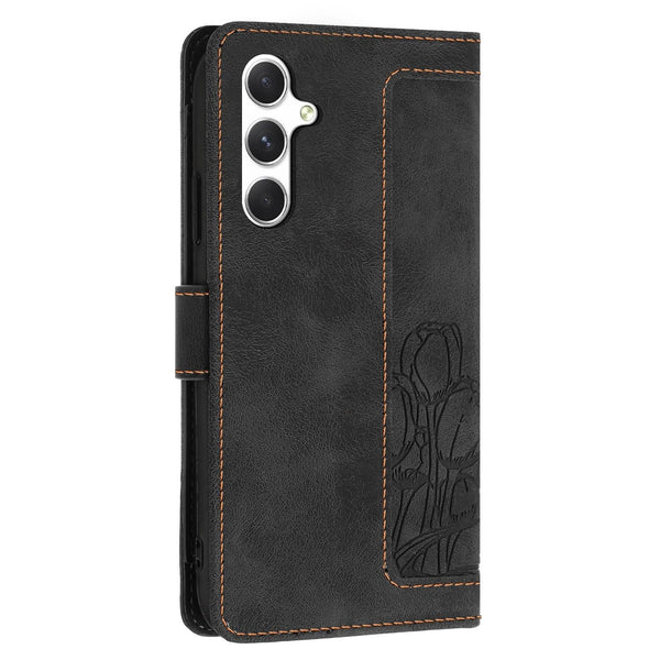 For Samsung Galaxy S25 5G Tulips Embossed Leather Phone Case with Lanyard(Black)