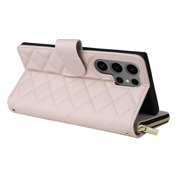 For Samsung Galaxy S25 Ultra 5G Crossbody Rhombic Zipper Tower Buckle Leather Phone Case with Lanyard(Beige)