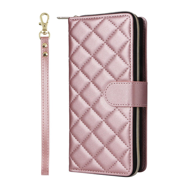 For Samsung Galaxy S25 Ultra 5G Crossbody Rhombic Zipper Tower Buckle Leather Phone Case with Lanyard(Rose Gold)