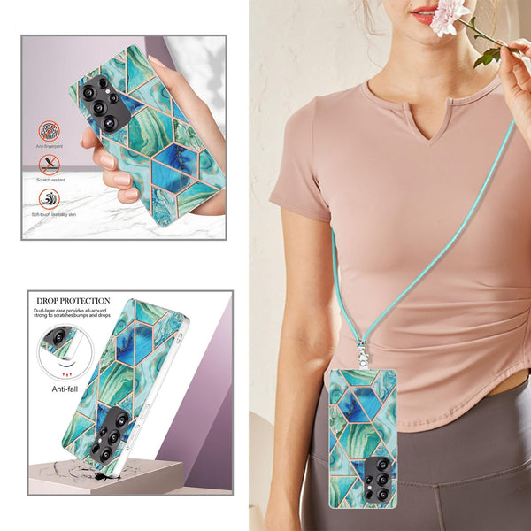 For Samsung Galaxy S25 Ultra 5G Electroplating IMD Splicing Dual-side Marble TPU Phone Case with Lanyard(Green)