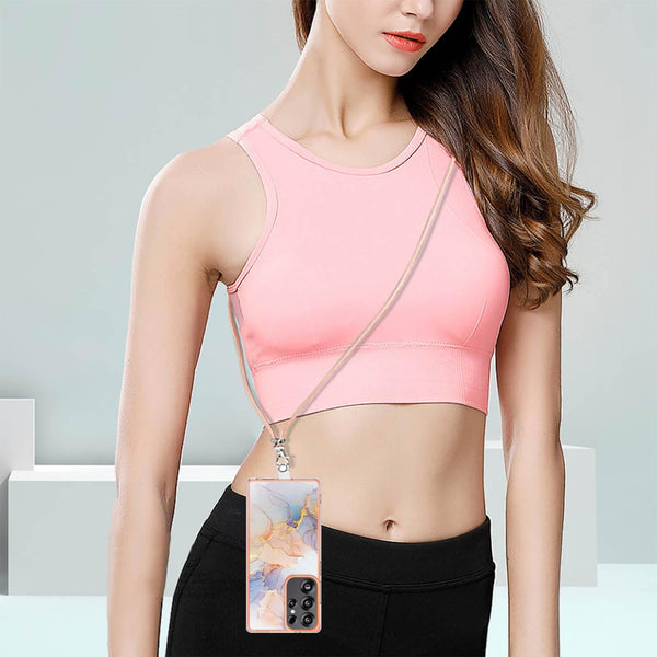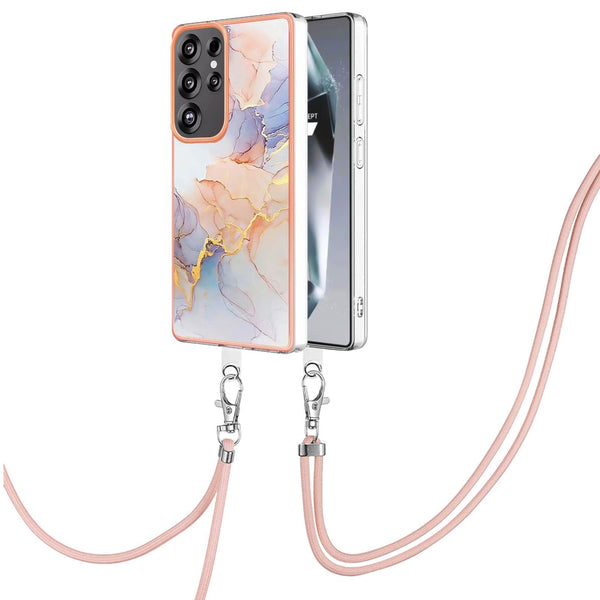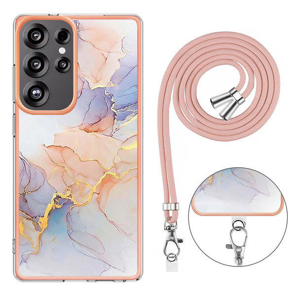 For Samsung Galaxy S25 Ultra 5G Electroplating Pattern IMD TPU Shockproof Case with Neck Lanyard(Milky Way White Marble)