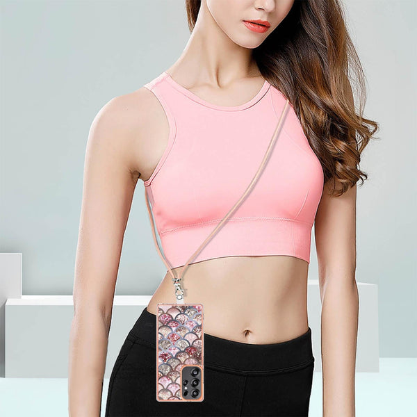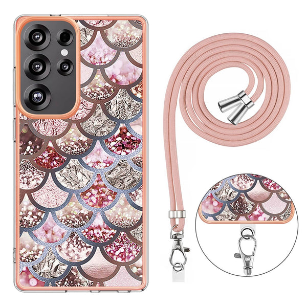 For Samsung Galaxy S25 Ultra 5G Electroplating Pattern IMD TPU Shockproof Case with Neck Lanyard(Pink Scales)