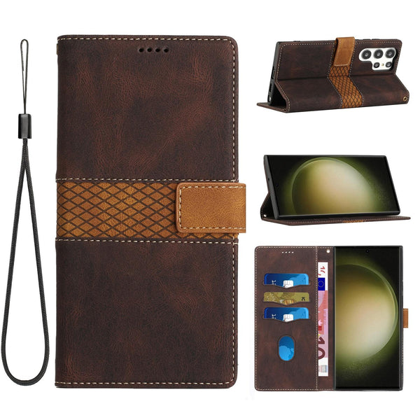 For Samsung Galaxy S25 Ultra 5G Grid Stitching Leather Phone Case with Lanyard(Brown)