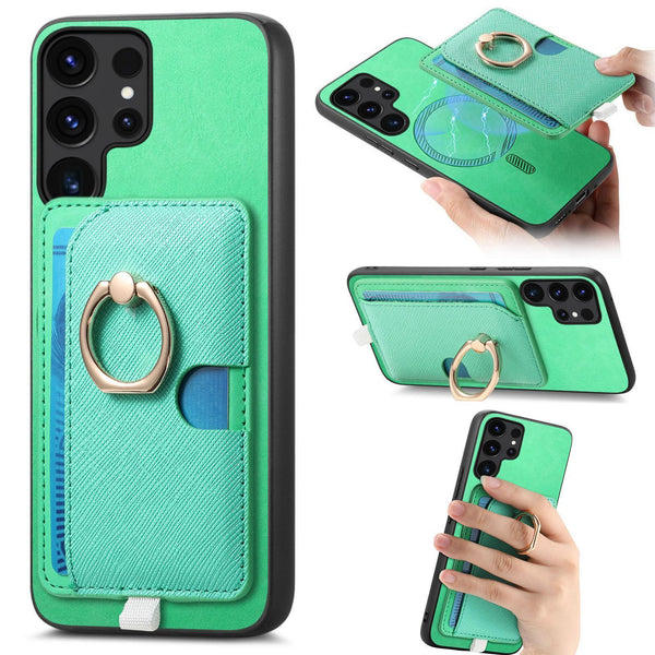 For Samsung Galaxy S25 Ultra 5G Retro Cross Leather Ring Side Insert Card Bag MagSafe Phone Case(Green)