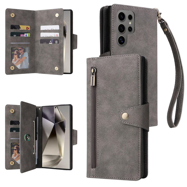 For Samsung Galaxy S25 Ultra 5G Rivet Buckle 9 Cards Three Fold Leather Phone Case(Grey)