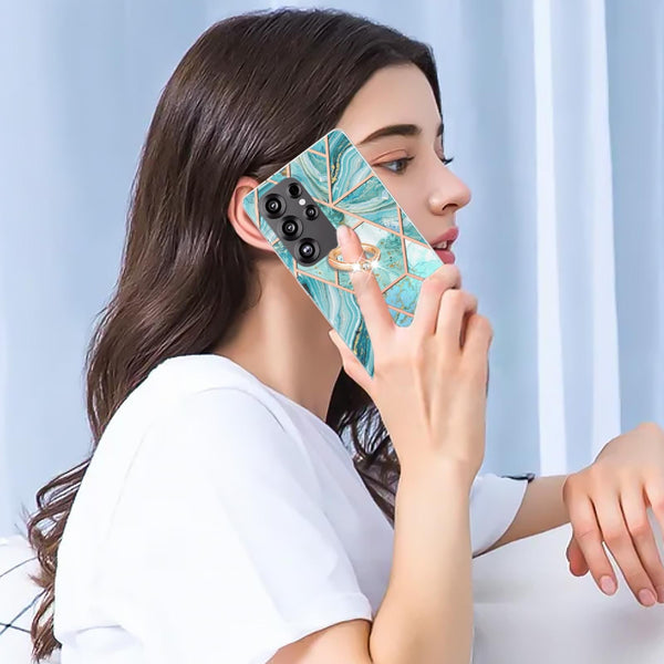 For Samsung Galaxy S25 Ultra 5G Splicing Marble Flower IMD TPU Phone Case Ring Holder(Blue)