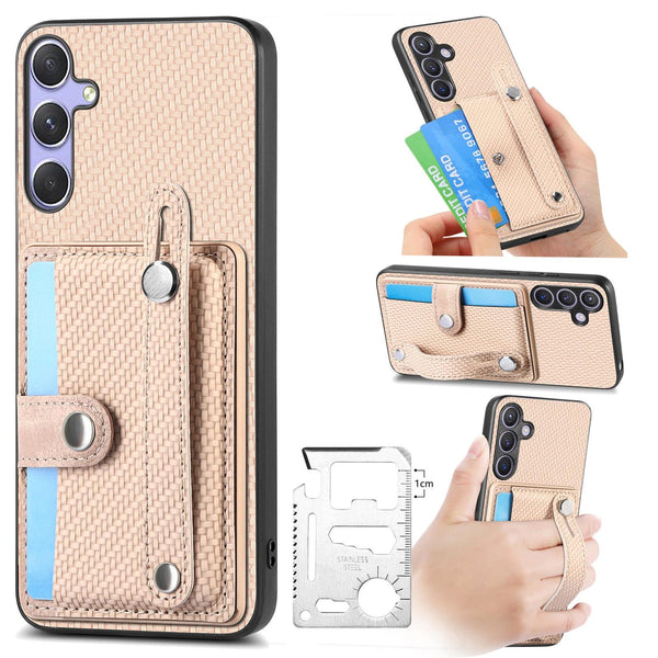 For Samsung Galaxy S25 Ultra 5G Wristband Kickstand Wallet Back Phone Case with Tool Knife(Khaki)