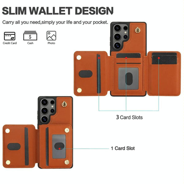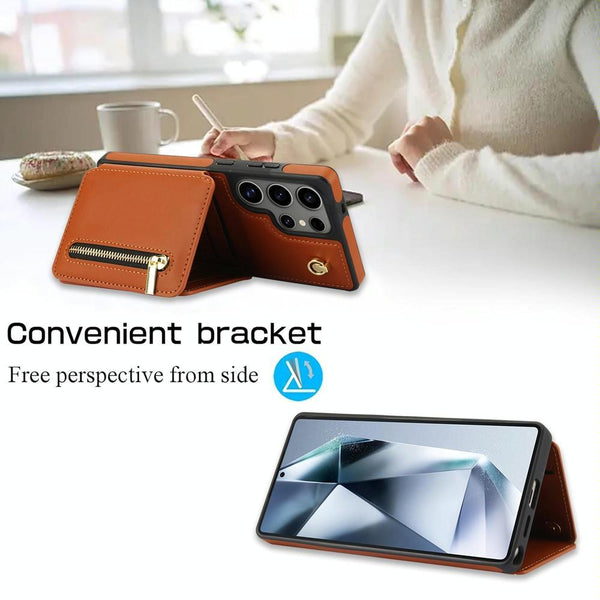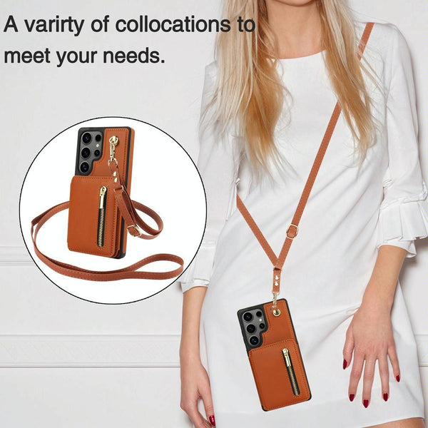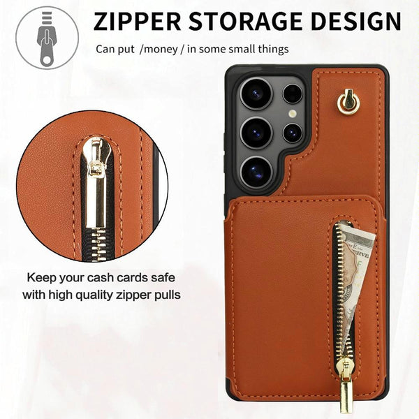 For Samsung Galaxy S25 Ultra 5G YM006 Skin Feel Zipper Card Bag Phone Case with Dual Lanyard(Brown)